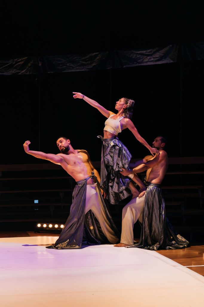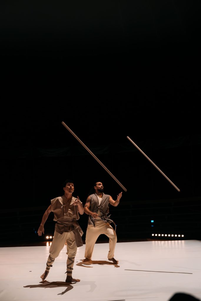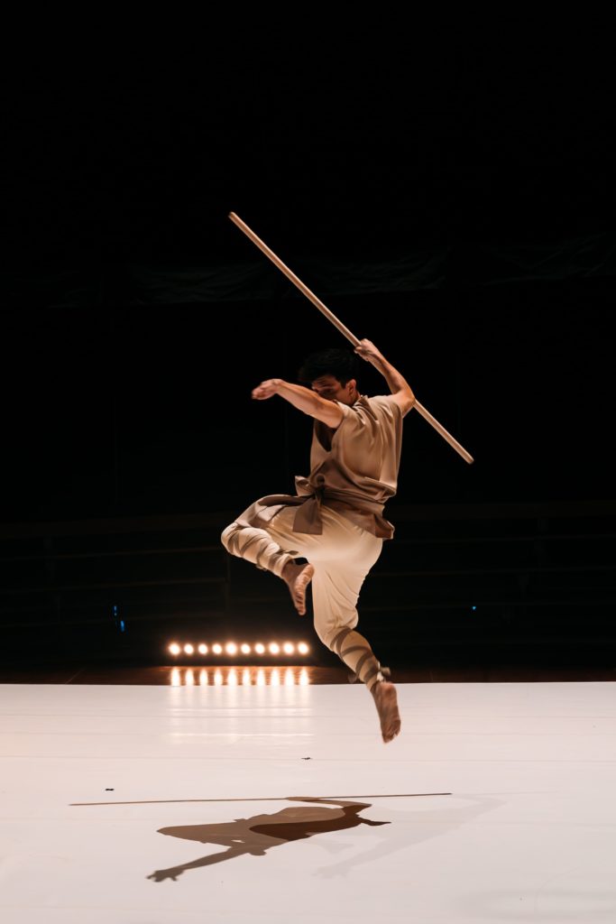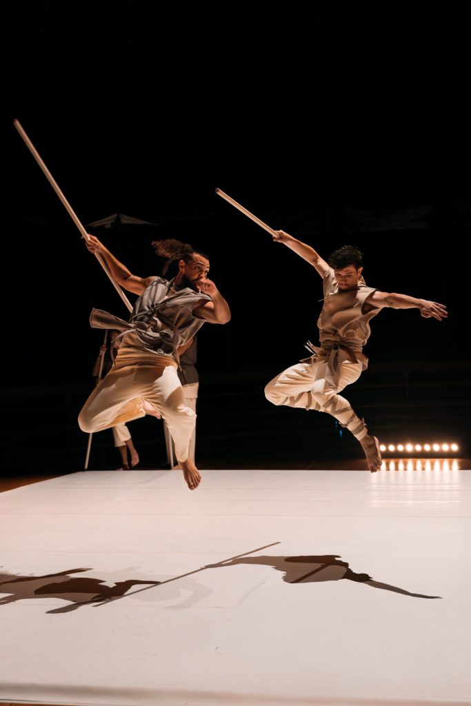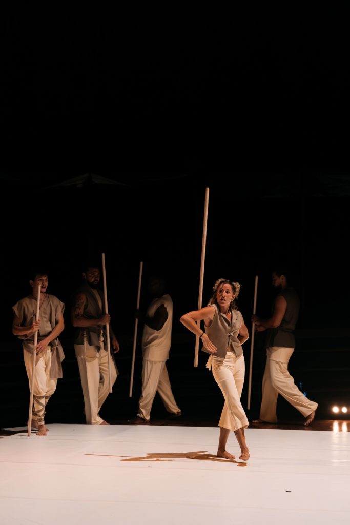 Cette pluridisciplinarité crée un spectacle à la fois visuel, physique et spirituel, où les corps dialoguent avec la scénographie immersive : totems, échasses, cerceau aérien et univers sonore en live.