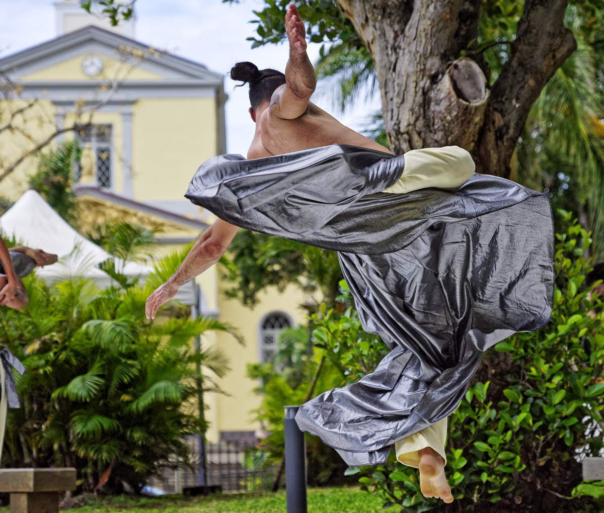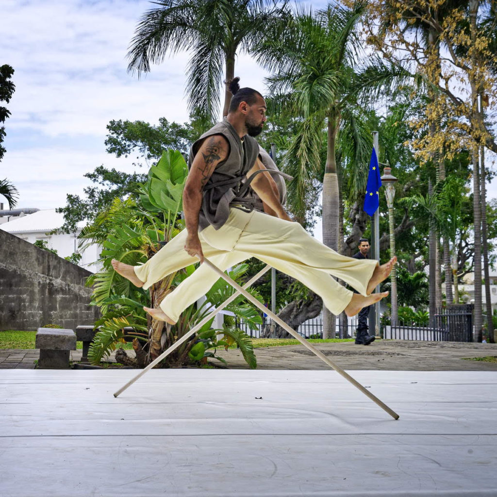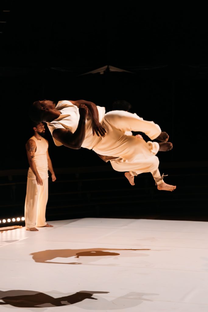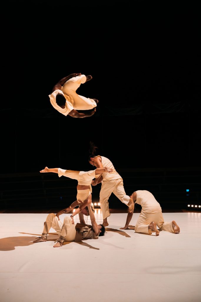 Cette pluridisciplinarité crée un spectacle à la fois visuel, physique et spirituel, où les corps dialoguent avec la scénographie immersive : totems, échasses, cerceau aérien et univers sonore en live.